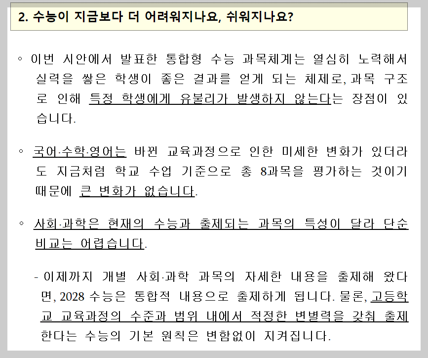 교육부가 발표한 '2028 대학입시제도 개편 시안'에 따르면 2028년부터 모든 학생은 동일한 과목으로 수능을 치루게 됩니다. 국어 2, 수학 3, 사회·과학탐구 17개 중 선택하는 기존의 방식은 사라집니다. 아래 문서를 다운로드 하시면 더욱 자세한 내용과 주요 질문에 대한 답을 확인하실 수 있습니다.