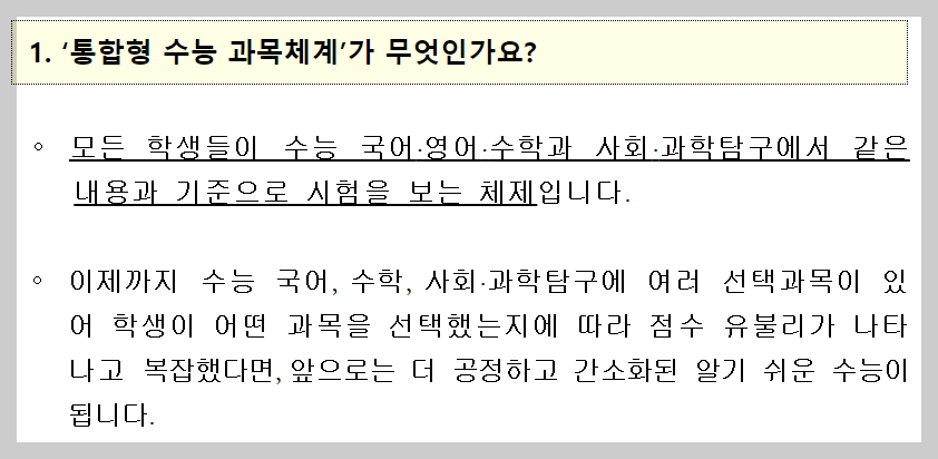 교육부가 발표한 '2028 대학입시제도 개편 시안'에 따르면 2028년부터 모든 학생은 동일한 과목으로 수능을 치루게 됩니다. 국어 2, 수학 3, 사회·과학탐구 17개 중 선택하는 기존의 방식은 사라집니다. 아래 문서를 다운로드 하시면 더욱 자세한 내용과 주요 질문에 대한 답을 확인하실 수 있습니다.