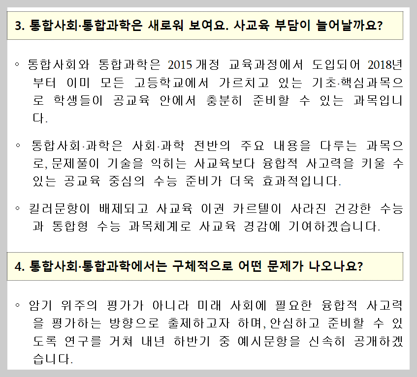 또한 수능의 중요도가 크게 증가했다고 평가되었습니다. 종로학원하늘교육 대표인 임성호는 "사회탐구, 과학탐구를 모두 본 뒤 문과와 이과가 완전히 통합되는 분위기로 가고 있는데 내신 부담이 완화되면서 수능의 중요도가 높아질 것"이라며 "서울대 등에서 미적분II+기하 등 심화 수학과목을 별도로 시험볼 경우 실질적인 문과와 이과 통합이 어려워질 수도 있다"고 지적했습니다. 다만 대학별 고사 강화에 대한 우려도 제기되었습니다. 광주교대 교수인 박남기는 "수능 문이과 융합은 긍정적으로 생각하지만 대학에 자율성을 부여한다는 접근은 대학 입시를 더 복잡하게 만든다는 의미입니다. 특목고, 외고, 자사고 등 학생들에게 유리해질 가능성이 큽니다"라며 평가했습니다. 서울대는 이번 개편안에 대해 기자 간담회를 열었으며 "수능에 대한 여러 우려점을 해결하는 시발점이 되었다"고 평가했습니다. 천명선 서울대 입학본부장은 "가장 중요한 것은 교육부가 대학의 자율성을 강조했다는 점"이라며 "이 자율성을 활용하여 교과과정의 취지를 벗어나지 않도록 변경해나갈 것"이라고 말했습니다.