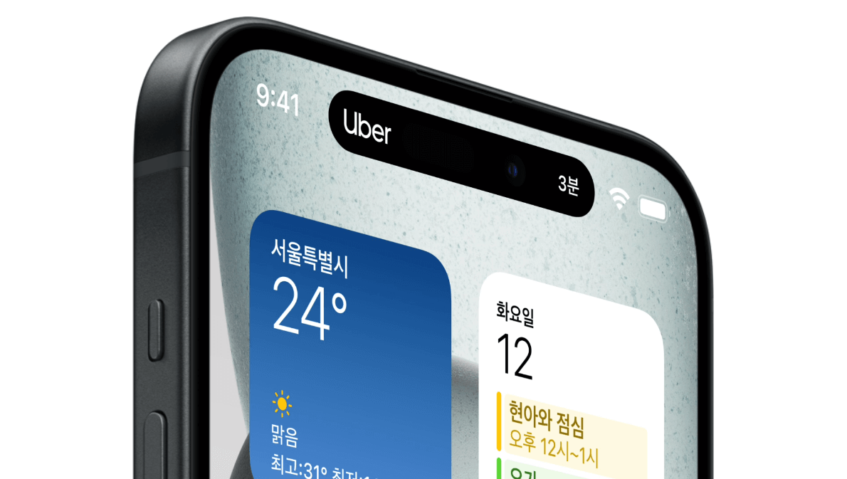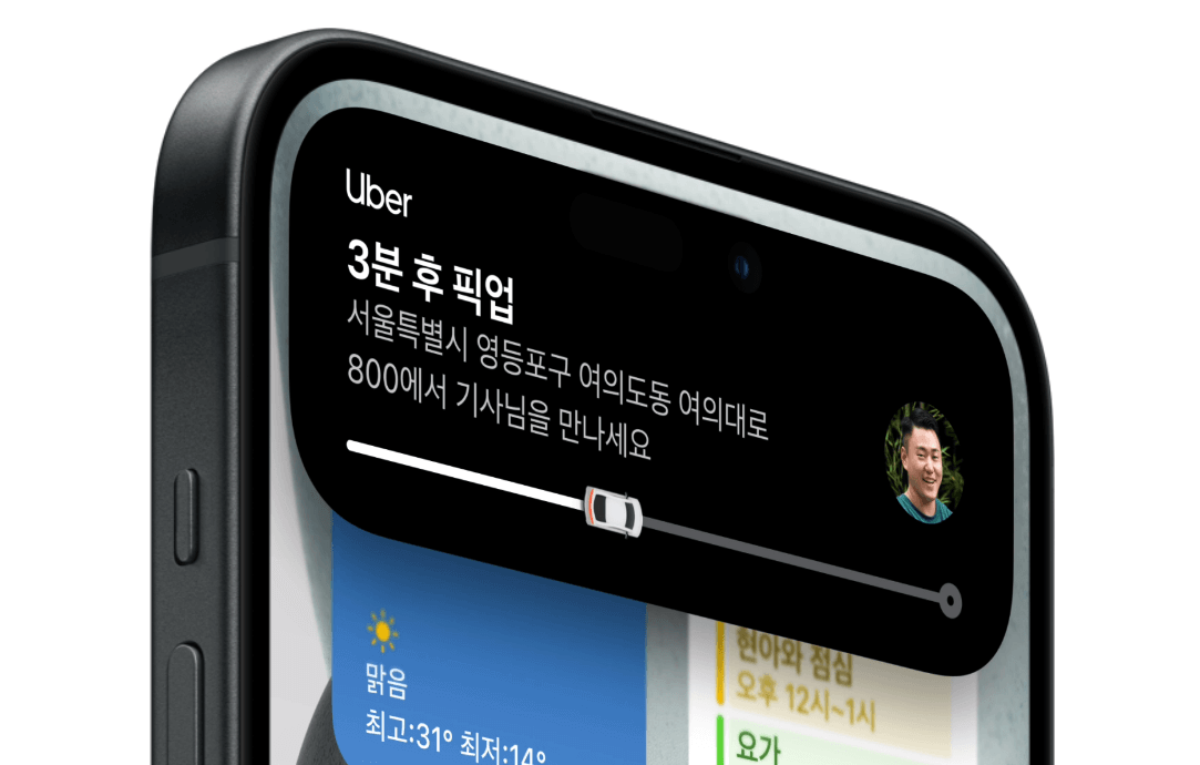 우선, 상단에 검은 타원형의 다이나믹 아일랜드를 사용하여 기존에 놀림 받았던 M자 탈모에서 벗어날 수 있었습니다. 상단에 알림이 오면 꾹 눌러 다이나믹 아일랜드를 넓게 펼쳐 내용을 확인할 수 있고 배터리 상태나 에어팟 연결 상태 등을 확인할 수 있습니다. 여러가지 알림이 오면 다이나믹 아일랜드도 여러 개로 표시됩니다. (아래 이미지 참고)