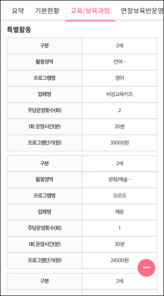 다음으로, 기본 현황 탭에서는 기본정보, 면적 및 공간 현황, 놀이터 현황, 건물 및 CCTV 설치 현황 등을 확인하실 수 있습니다. 교육/보육과정 탭에서는 교육계획안을 다운로드할 수 있게 올라와있는 경우도 있고 반 별로 보육료, 기타 필요경비 등 금액이 상세히 나와있습니다. 연장보육반 운영 탭에서는 연장보육반을 운영하는지, 차량을 운행하는지 등 내용을 확인하실 수 있습니다.