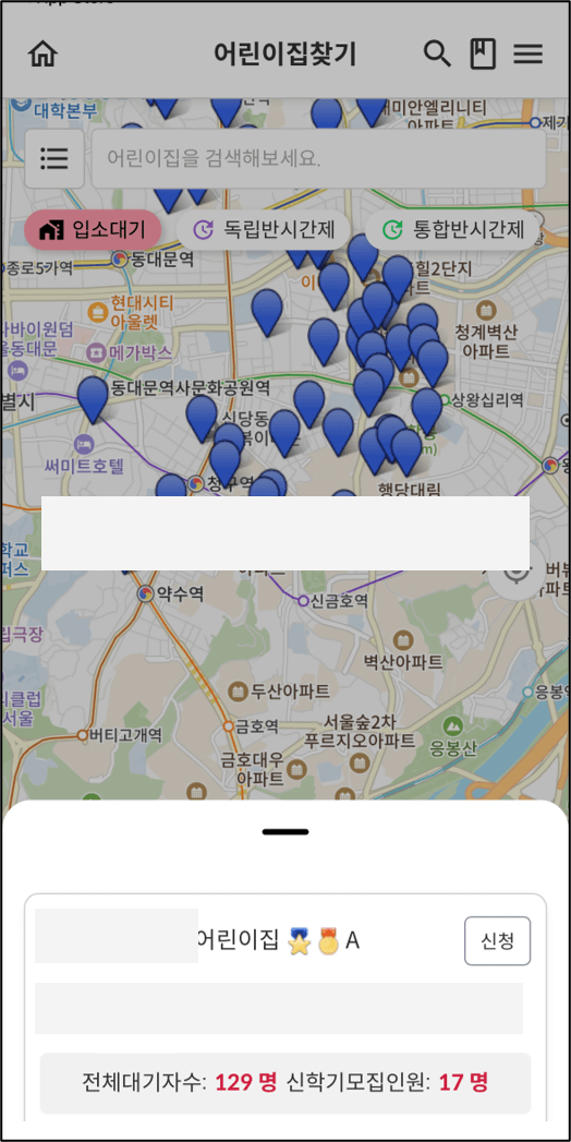 앱에서는 지도로 주변 어린이집을 한눈에 확인할 수도 있으며, PC와 같이 목록으로도 확인 가능합니다. (검색창 바로 옆 아이콘을 터치하시면 목록으로 전환됩니다.) 또한 최상단 어린이집 찾기 글씨 옆 돋보기 아이콘을 터치하시면 지역, 어린이집 유형 등 상세 조건을 입력하여 어린이집을 찾으실 수도 있습니다.