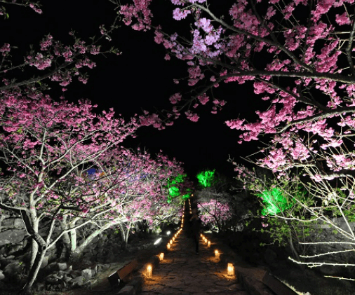 올해엔 1월 26일쯤 오키나와 북부에 방문하신 관광객 분이 나키진 성터에서 벚꽃축제를 즐겼다고 합니다. 매해마다 조금씩 기간이 달라지지만 작년에는 1월 21일부터 29일까지 "나키진 구스쿠 벚꽃축제"가 열렸고 야간 라이트업도 진행되었다고 합니다.