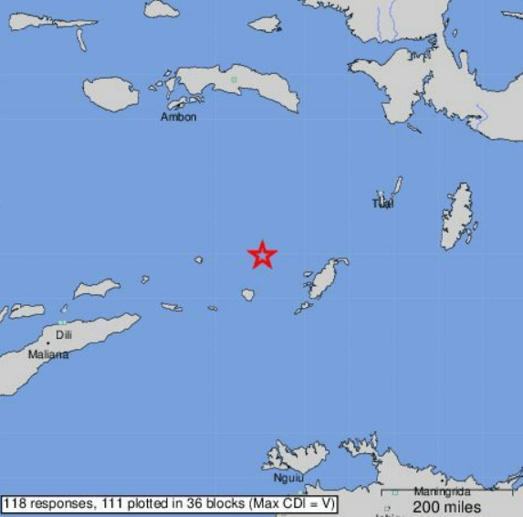 정확한 위치는 인도네시아 암본 남남동쪽의 430km 해역입니다. 7.09 S(위도), 130.04E(경도)