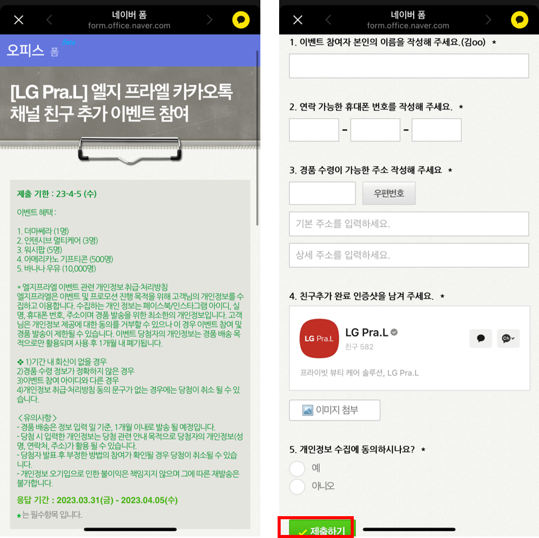 프라엘에서 온 메시지를 누르시면 아래 "카카오톡 채널 추가 이벤트" 버튼이 있습니다. 이 버튼을 누르시면 "이벤트 참여하기" 메시지가 뜹니다. "이벤트 참여하기" 버튼을 통해 접속하시고 아래로 스크롤하여 성함, 휴대폰 번호, 경품 수령 가능 주소 등 간단한 정보를 입력하고 아까 채널 추가하고 캡처한 화면 이미지까지 첨부한 후 제출 하면 참여가 완료됩니다.